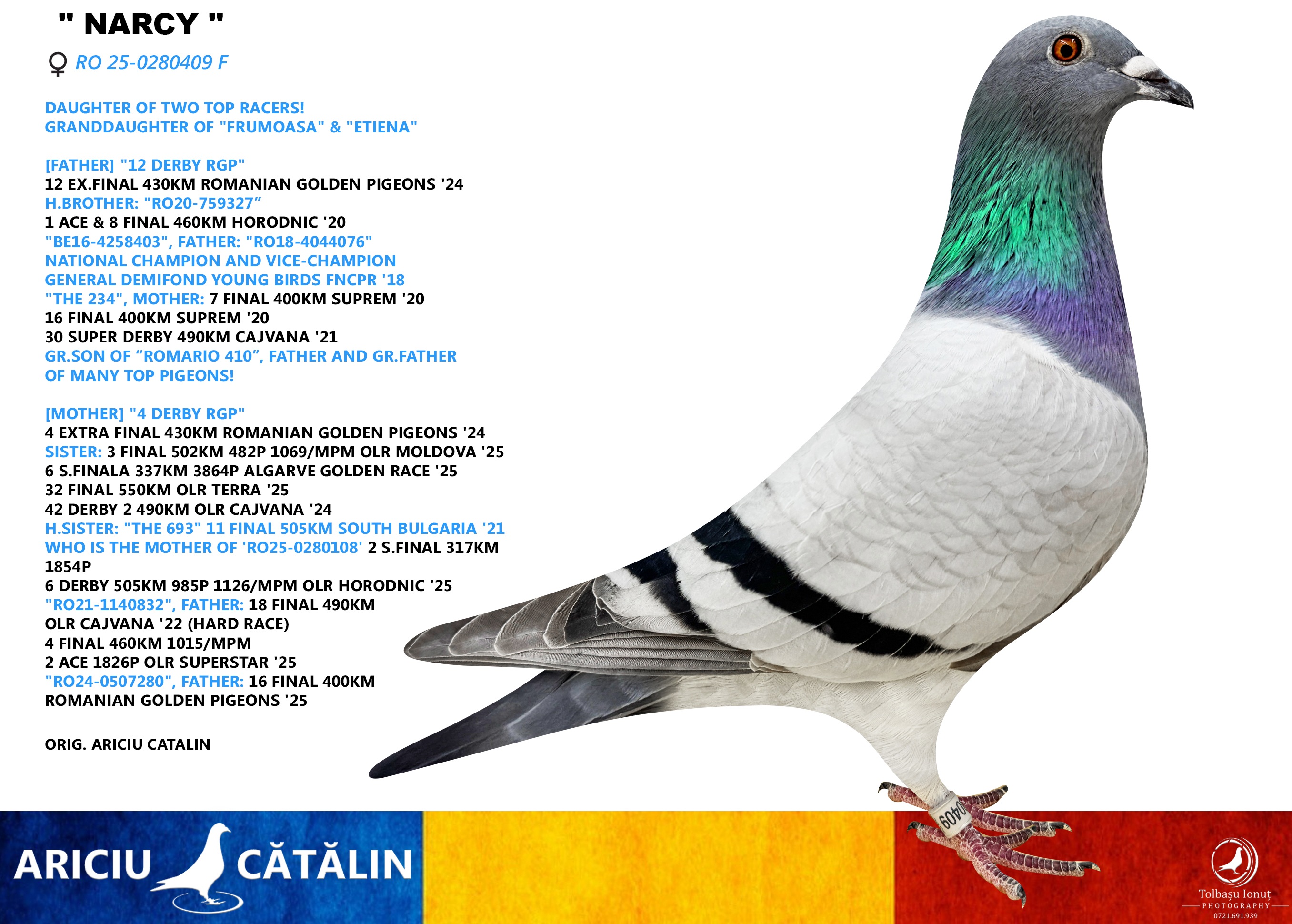 DAUGHTER OF 4TH AND 11TH EX.DERBY 430KM ROMANIAN GOLDEN PIGEONS '24; GR.DAUGHTER OF "FRUMOASA" & "ETIENA"